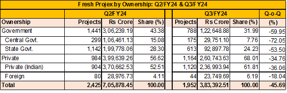 Fresh investment at state government levels after posting a good growth of 30.75 percent in the first quarter of this fiscal, declined in the next two quarters to 8.03 percent and 53.50 percent. In Q3/FY24, state-owned agencies announced 613 new projects worth Rs 92,897.78 crore. Compared with the decline seen in the Government sector, the decline in the Private sector was comparatively milder at 34.76 percent.